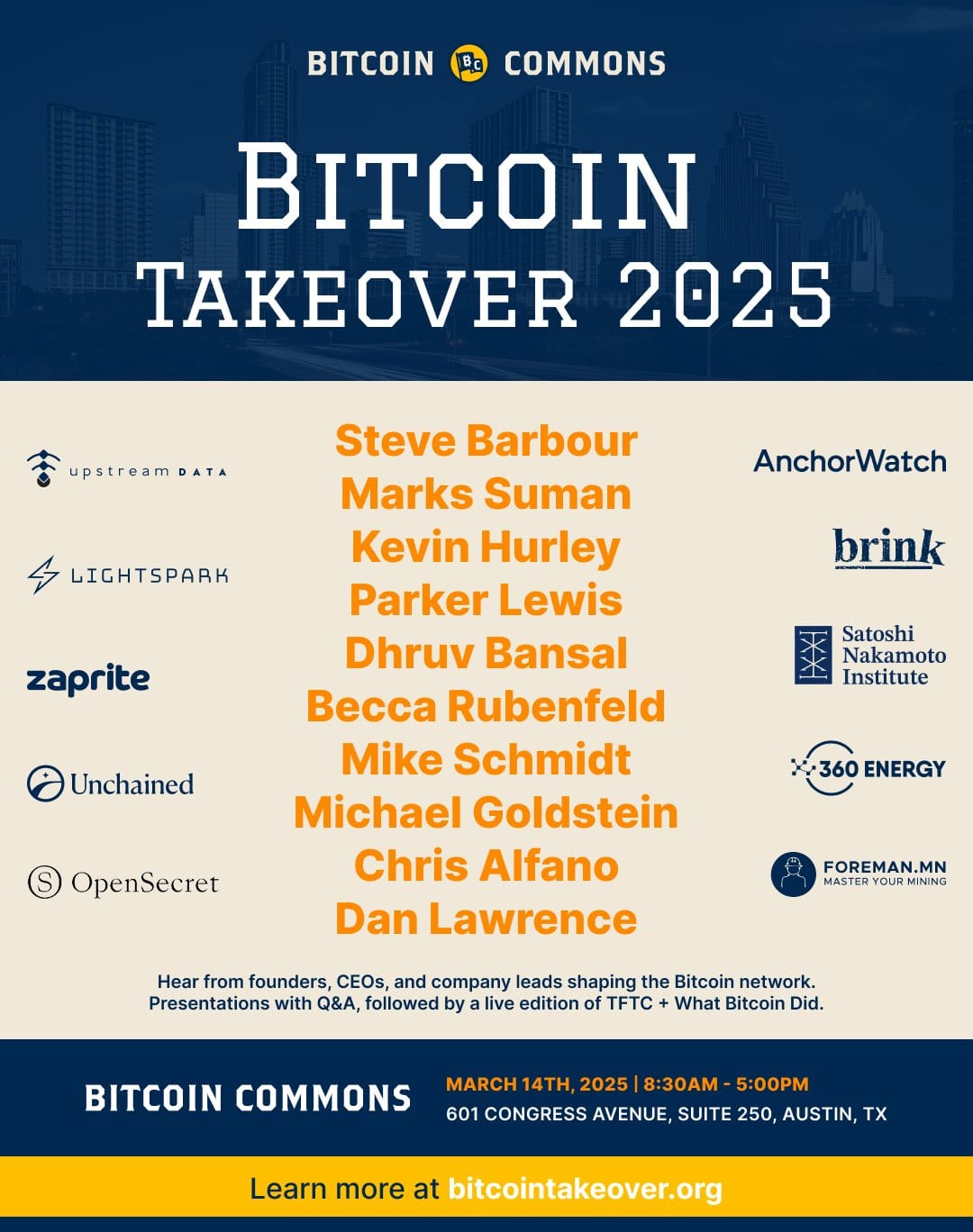Friends - the Bitcoin Takeover is back for the 2025 edition, Friday March 14th in Austin, TX. For whatever reason, SXSW has no interest in bitcoin, which is why we throw the Takeover. We'll be hosting events all week at the Bitcoin Commons with the main event featuring ten founders, CEOs & company leads presenting on the infrastructure powering the bitcoin network!