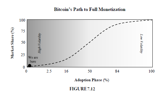 The debate as to whether bitcoin will be used as a medium of exchange really has nothing to do with elasticity, despite the claim that it does. Instead, it has everything to do with stability of price or volatility. Stability in the price or value of bitcoin will come from increased adoption. Stability is an emergent property of adoption–specifically mass adoption. Stability will emerge when sufficient people adopt bitcoin–when incremental adoption can only represent a fraction of existing (or in-place) demand rather than multiples or orders of magnitude. Simplistically, think about that in terms of when more than 50% of the world has adopted bitcoin or when greater than 50% of the global demand to store value in money has adopted bitcoin.