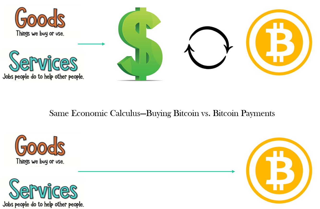 The decision to accept bitcoin as payment directly for goods and services is the same economic calculus as exchanging bitcoin for fiat at a bitcoin exchange or brokerage firm. Once an individual figures out that bitcoin will store value and why, the idea logically follows–that accepting bitcoin as payment is the same as buying bitcoin. It is just a different path to the same end of getting bitcoin in a business treasury or on balance sheet (personal or business).