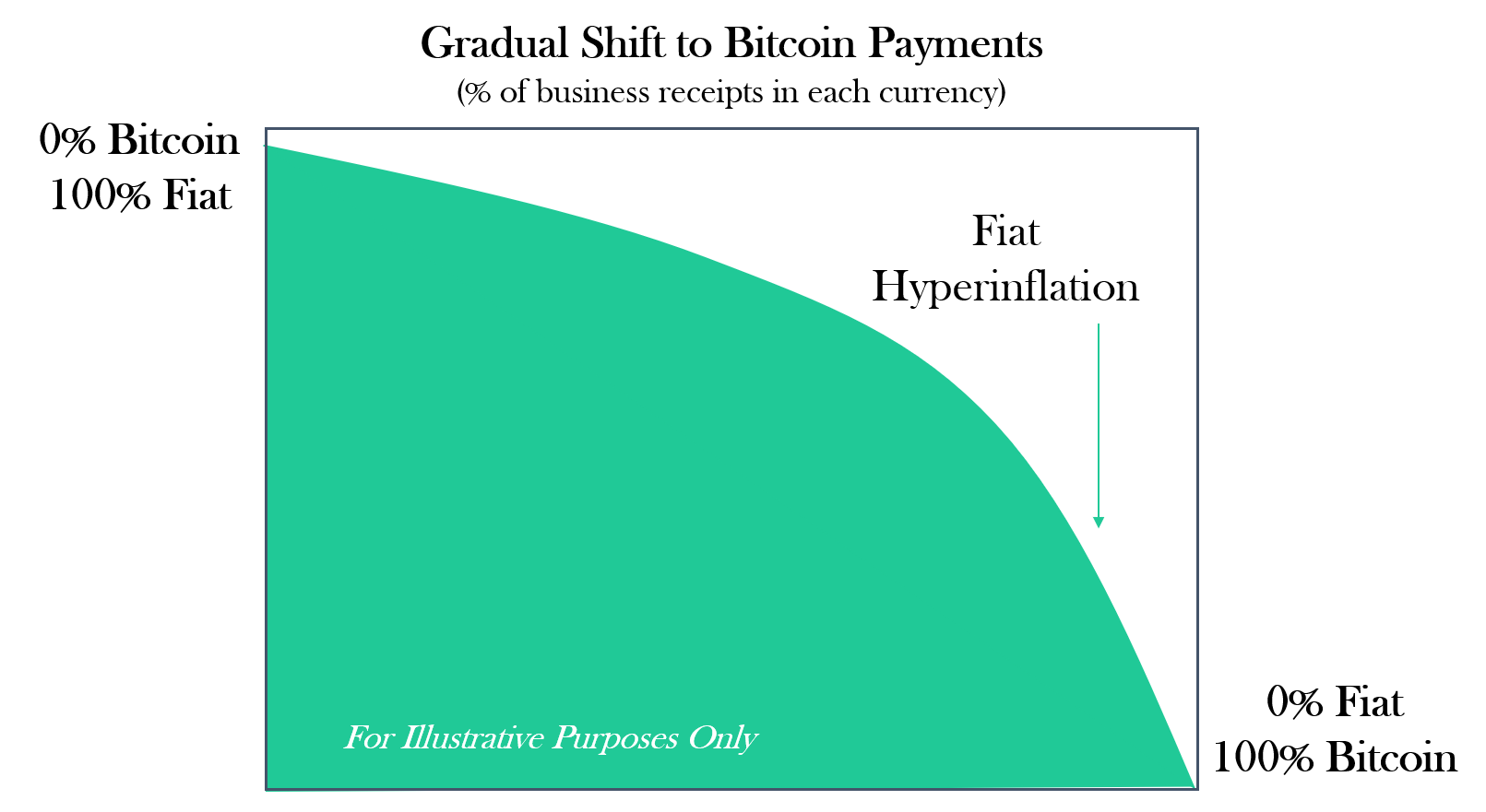And while there may be people or businesses out there that have the ability and power to demand 100% of receipts in bitcoin, the transition to bitcoin payments in most cases will just as logically be a gradual shift as the shift to saving in bitcoin typically is. For example, if a business takes in 2% receipts in bitcoin and 98% receipts in dollars (or another fiat currency), the business might never have to convert back to dollars. But, if the merchants receives too high a percentage of receipts in bitcoin, it can periodically convert working capital back to dollars as necessary. Just as with saving in bitcoin, the shift to bitcoin payments being a gradual and progressive one makes it much more simple than meets the eye. It all starts by a merchant deeming it necessary or prudent to give an option to customers to pay in bitcoin as a means to de-risk the future and the long term.