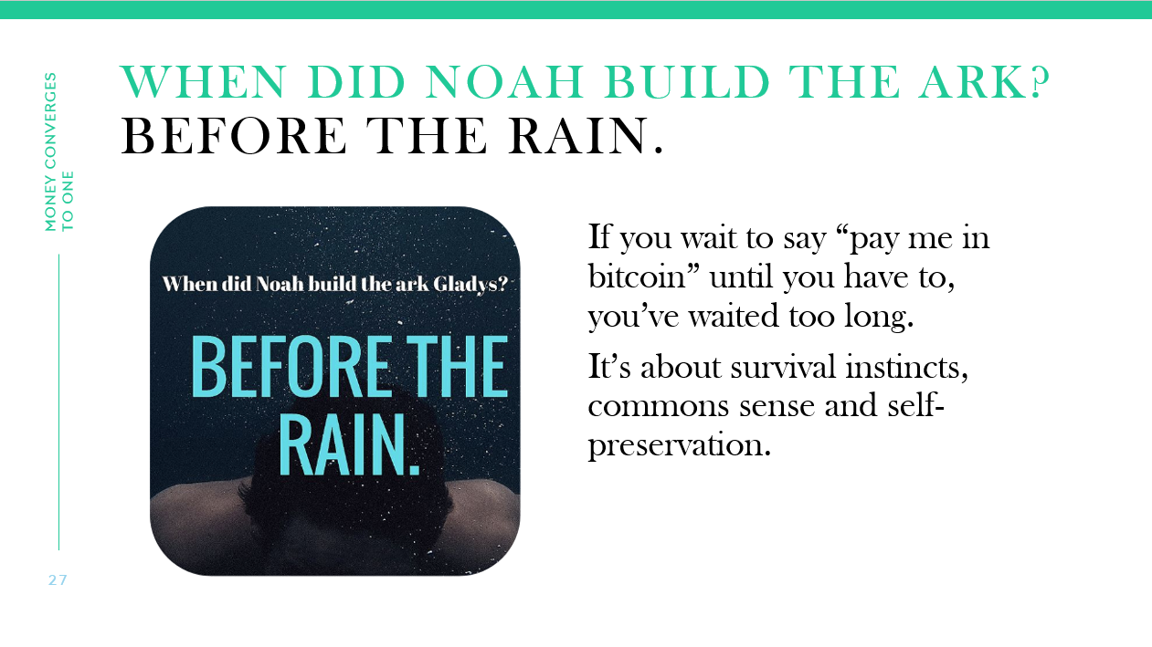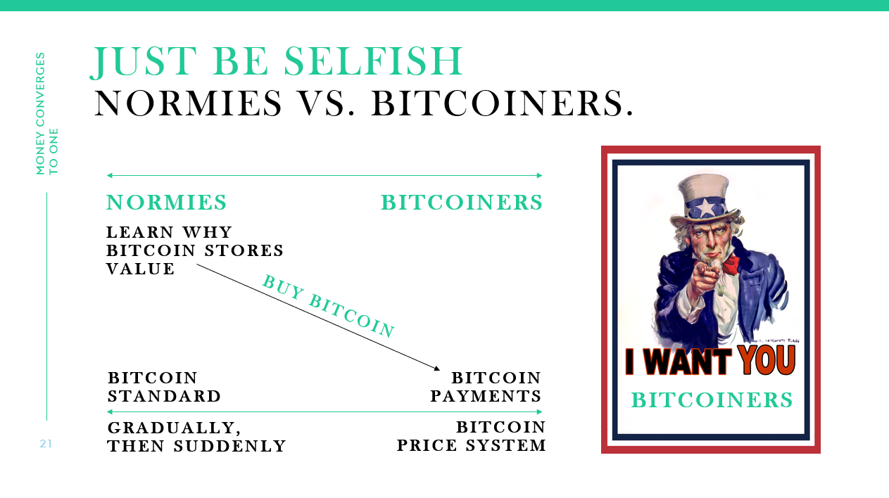If you are a bitcoiner, start asking to be paid in bitcoin or if you run a business, at least give your customers the option to pay you in bitcoin. If you are not, read The Bitcoin Standard or my soon-to-be-released book, Gradually, Then Suddenly.