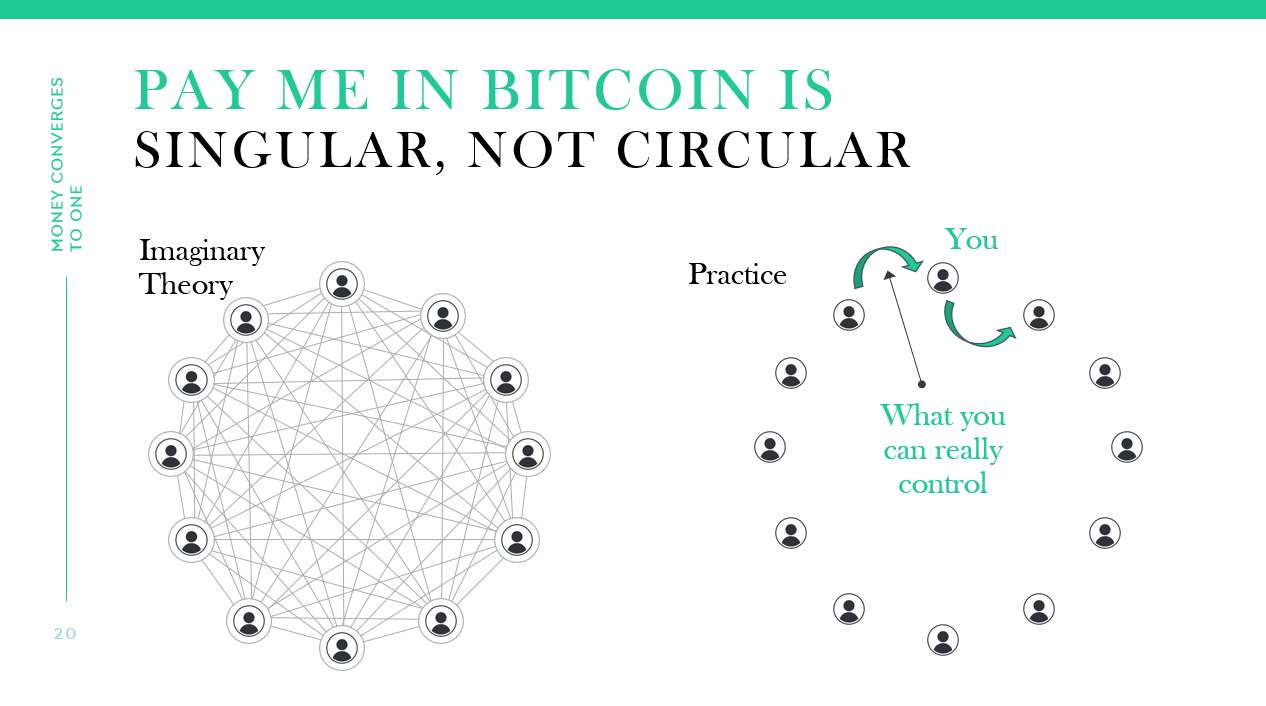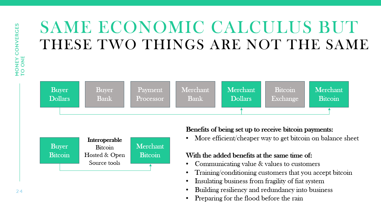On a fundamental level–once someone determines that bitcoin will store value–it becomes logical to acquire the bitcoin as efficiently as possible. While the economic calculus is the same, receiving bitcoin payments is a more direct and efficient path than moving money through the fiat system only to then acquire bitcoin (if you want the bitcoin). In essence, the rationale is the same economically but the two rails are fundamentally different. As an individual or merchant, once you know you want to save in bitcoin, it becomes very logical why you would want to cut out an entirely different currency as an intermediary and in an end-state.